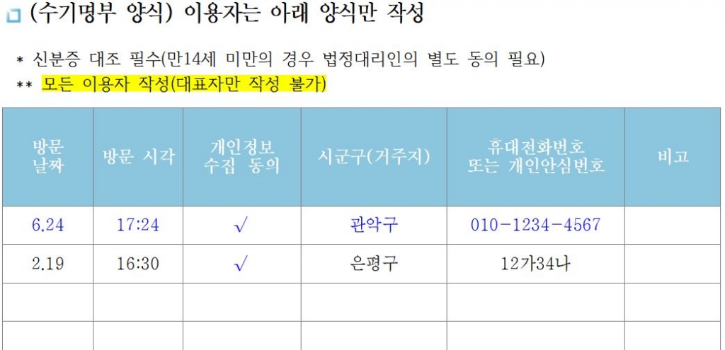 ์ค๋๋ถํฐ ์๋น์ด๋ ์นดํ ๋ฑ ๋ค์ค์ด์ฉ์์ค์ ๋ฐฉ๋ฌธํด ์ฝ๋ก๋19 ์๊ธฐ(ๆ่จ) ์ถ์ ๋ช ๋ถ์ ๋ฐฉ๋ฌธ ๊ธฐ๋ก์ ๋จ๊ธธ ๋ ํด๋์ ํ๋ฒํธ ๋์ '๊ฐ์ธ์์ฌ๋ฒํธ'๋ฅผ ์ฌ์ฉํ๋ค.