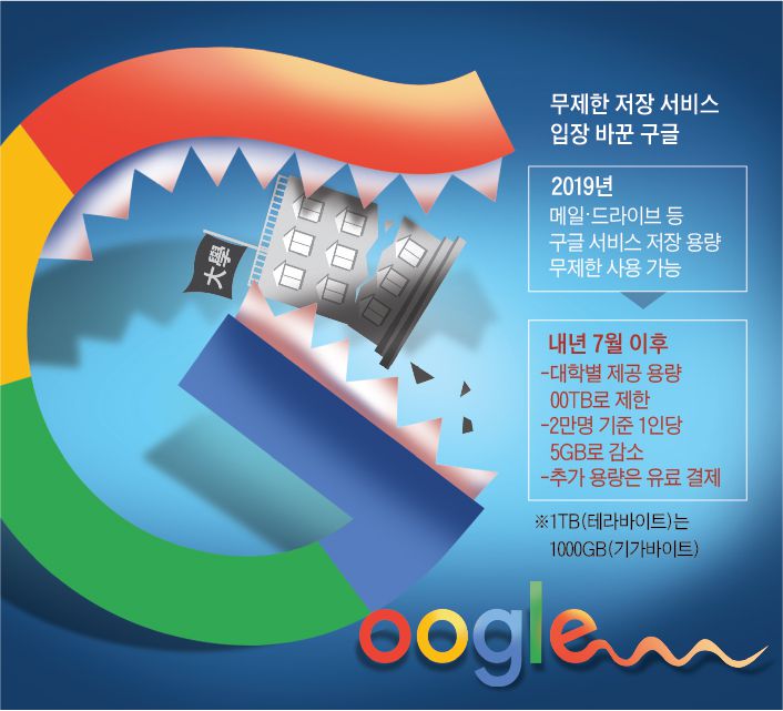 ๋ํ๋ค์ ๊ตฌ๊ธ์ด ๋ฐํ ๊ธฐ๋ณธ ์ ์ฅ ์ฉ๋์ธ 100TB๋ก๋ ํ์ฌ ํ๊ต ๊ตฌ์ฑ์์ ๋ฐ์ดํฐ๋ฅผ ์ ๋๋ก ์์ฉํ๊ธฐ ์ด๋ ต๋ค๋ ์ ์ฅ์ด๋ค. ์์ธ๋๋ ์ง๋ 5์ ๊ธฐ์ค 7๋ง4000๋ช (์กธ์ ์·ํด์ง ์ง์ ํฌํจ)์ด ์ ์ฅ ์ฉ๋ 7000TB๋ฅผ ์ฌ์ฉํ๊ณ ์๋ค. ๊ตฌ์ฑ์ 1์ธ๋น 100GB๋ฅผ ์ฐ๊ณ ์๋๋ฐ ์ ์ ์ฑ ์ด ์ ์ฉ๋๋ฉด 5GB๋ก ์ค๊ฒ ๋๋ค. ๊ณ ๋ ค๋๋ ์ ๊ตฌ์ฑ์์ ์ฌ์ฉ ์ฉ๋์ด 6400TB๋ฅผ ๋์ด ์์ผ๋ก ์ ์ฅ ๊ณต๊ฐ์ 98% ์ด์์ ๋น์์ผ ํ๋ค. ๊ฒฝํฌ๋๋ ์ด๋๋ก ๊ตฌ๊ธ ์ ์ฑ ์ด ์ํ๋ ๊ฒฝ์ฐ ๊ตฌ๊ธ ๊ณ์ ์ ๊ฐ๊ณ ์๋ 8๋ง3443๋ช ์ค ์กธ์ ์๊ณผ ํด์ง์ ๋ฑ 4๋ง3000๋ช ๊ฐ๋์ด ๊ณ์ ์ ์์ ์ผ ํ๋ค.
