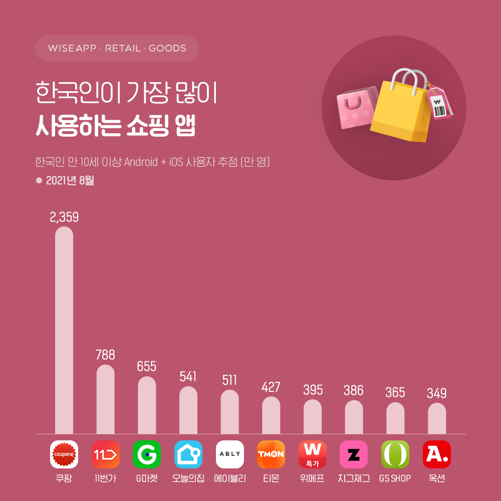 ๋ชจ๋ ์ธ๋๋ฅผ ํฉ์ณ ๊ฐ์ฅ ๋ง์ด ์ฌ๋์ด ์ฌ์ฉํ ์ผํ ์ฑ์ ‘์ฟ ํก’์ผ๋ก ์ง๋ 8์ ํ ๋ฌ๊ฐ 2,359๋ง ๋ช ์ด ์ฌ์ฉํ ๊ฒ์ผ๋ก ์กฐ์ฌ๋๋ค. ๊ทธ ๋ค๋ 11๋ฒ๊ฐ 788๋ง ๋ช , G๋ง์ผ 655๋ง ๋ช , ์ค๋์์ง 541๋ง ๋ช , ์์ด๋ธ๋ฆฌ 511๋ง ๋ช , ํฐ๋ชฌ 427๋ง ๋ช , ์๋ฉํ 395๋ง ๋ช , ์ง๊ทธ์ฌ๊ทธ 386๋ง ๋ช , GS SHOP 365๋ง ๋ช , ์ฅ์ 349๋ง ๋ช ์์ด์๋ค.