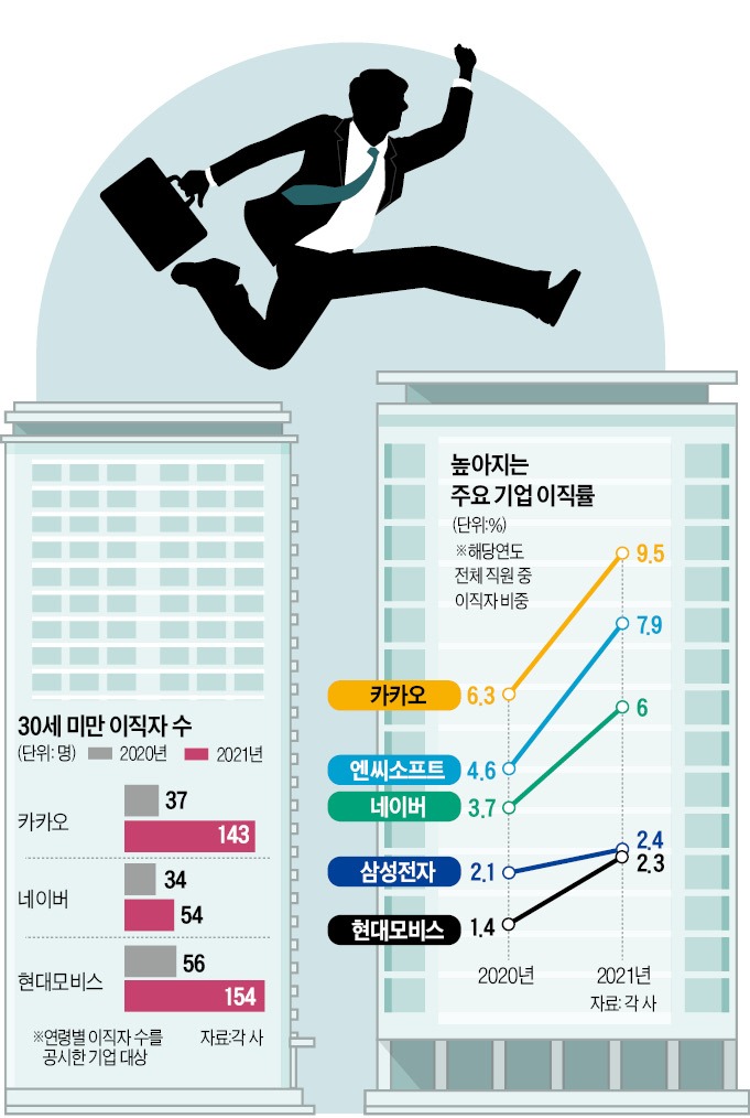 ๋ํ IT๊ธฐ์ ์์ ์ด์ง ์ฆ๊ฐ ํ์์ด ๋๋๋ฌ์ก๋ค. ์นด์นด์ค๋ ์ง๋ํด ํด๊ณ ์ ์ ๋ ํด์ง์๋ฅผ ๋บ ์๋ฐ์ ์ด์ง์๊ฐ 330๋ช ์ผ๋ก 2020๋ 171๋ช ์์ ๋ ๋ฐฐ ๊ฐ๊น์ด๋ก ๋์๋ค. ์ด์ง๋ฅ ์ 6.3%์์ 9.5%๋ก ๋ฐ์๋ค. ๊ฐ์ ๊ธฐ๊ฐ ๋ค์ด๋ฒ์ ์์จ์ํํธ์ ์ด์ง๋ฅ ๋ ๊ฐ๊ฐ 3.7%์์ 6.0%๋ก, 4.6%์์ 7.9%๋ก ๋์์ก๋ค.
